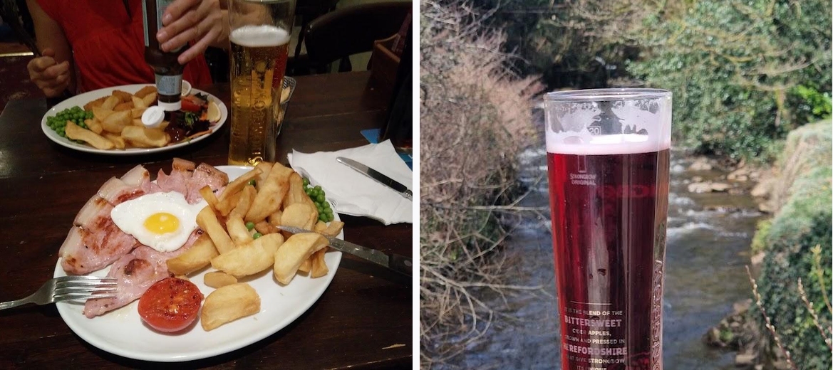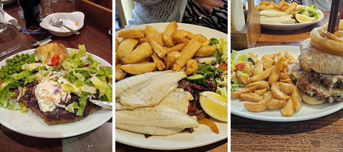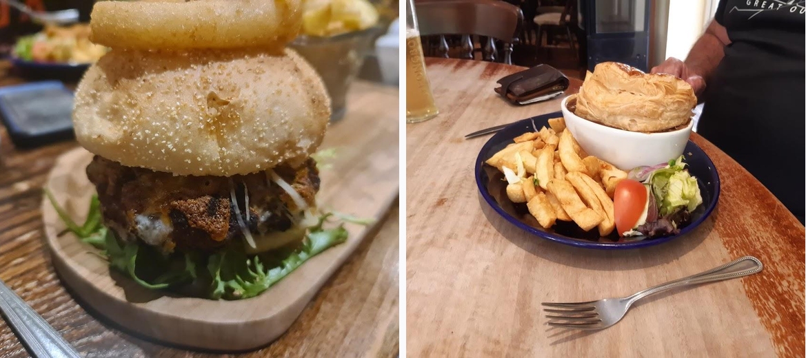 Our friend from Malaysia booked this restaurant. He mentioned that the famous actor Richard Burton lived in the village, and indeed, there were many framed pictures of him displayed on the walls. When we arrived, it wasn't very crowded since it was a Monday, but we had to wait at the bar until a staff member approached us. Our friend got an appetizer. We then ordered a beef burger, ale pie, and I tried the fajitas. The portions were huge, and while we couldn’t finish our meals, they were really good. It was definitely worth visiting this restaurant.